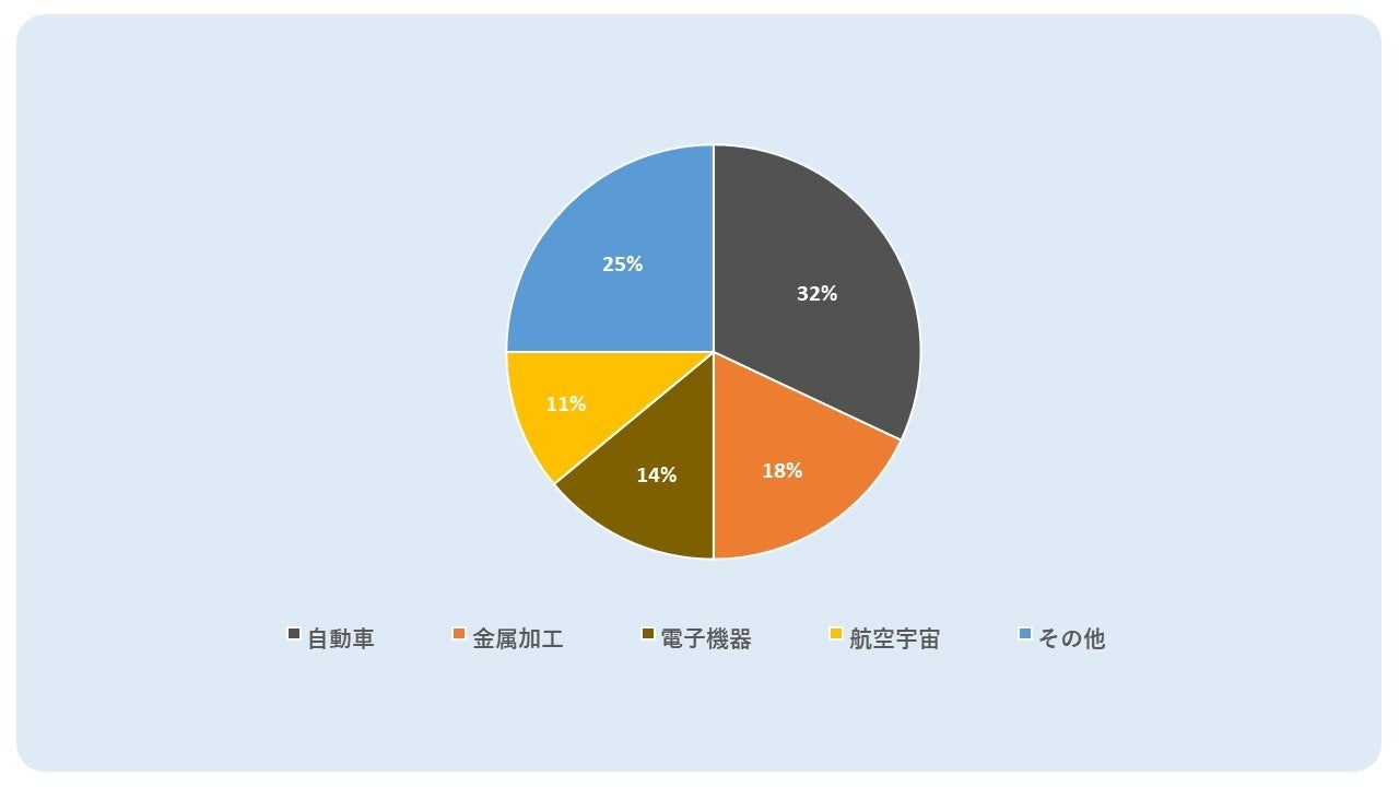 エンドユーザー業界では、自動車、金属加工、電子機器、航空宇宙などに分類されます。 自動車は、他のセグメントの中でも大きなシェアを占めています。