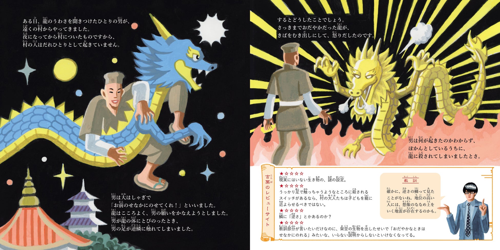そんな寺田寛明氏が絵本『故事成語ツッコミ事典 もしも言葉のレビューサイトがあったら』を刊行しました。中国の昔話からできた教訓・故事成語には、ひなたぼっこしていたハマグリの話「漁夫の利」、クマの胆を舐める男が登場する「臥薪嘗胆」など、奇抜な物語が存在します。それらの物語に、寺田寛明がユーモラスな視点でツッコミを入れる絵本です。