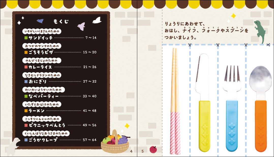 「いそがしいクマさんのためのサンドイッチ」「なきむしドラゴンのためのおにぎり」など、本書のテーマはすべて『だれかのためにごはんをつくること』をきっかけとしています。どんな食材を組み合わせて、どうやって盛り付けるかまで、すべてが自由。相手のことを考えながら想像をふくらませて組み立てることで、創造性や共感性がしぜんに身につきます。