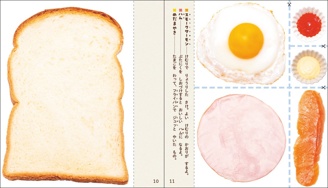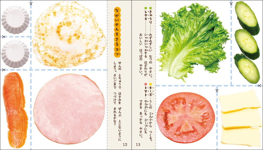 従来、はさみワークは描かれたイラストを切り取るものが主流でした。本書では、現役保育士たちの声をもとに、子どもたちが大好きな『本物』の食べ物の写真を完全撮り下ろし! 食材の「表」と「裏」も再現しており、たとえば真ん丸な黄身のめだまやきのパーツをひっくり返すと、こんがり焼けた白身の裏側が現れます。迫力満点の食材の写真は、色や形の認識力をゆたかに引き出します。はさみで切り取るのも楽しく、盛り付けまで積極的に取り組むことができます。