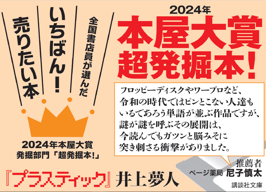 2024年本屋大賞の発掘部門で、井上夢人さん『プラスティック』(講談社文庫)が「超発掘本!」を受賞しました!!