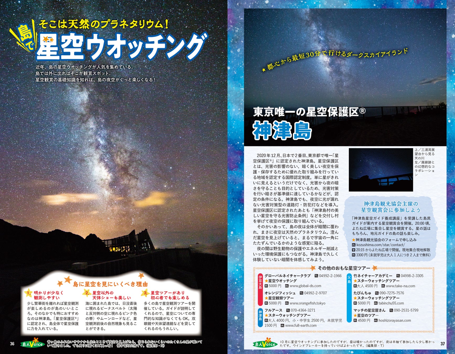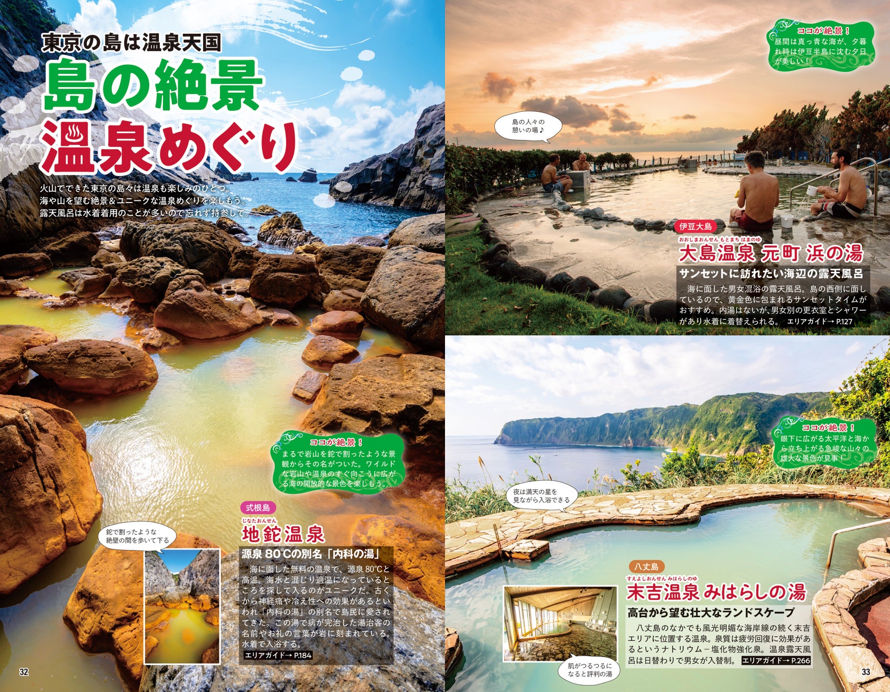 豊かな海に囲まれた火山島という共通点をもつ東京諸島。雄大な自然が魅せる美しい表情は感動必須です。紺碧の海を見下ろす展望台や、思わず目をうばわれる独自の地形、大自然と一体化するワイルドな温泉、宇宙に浮かんでいるような気分になる満天の星空など、島ならではの絶景スポットをたっぷりご紹介。思わず二度見してしまう、島で見つけたふしぎ&心がざわつく風景にも注目してみてください。