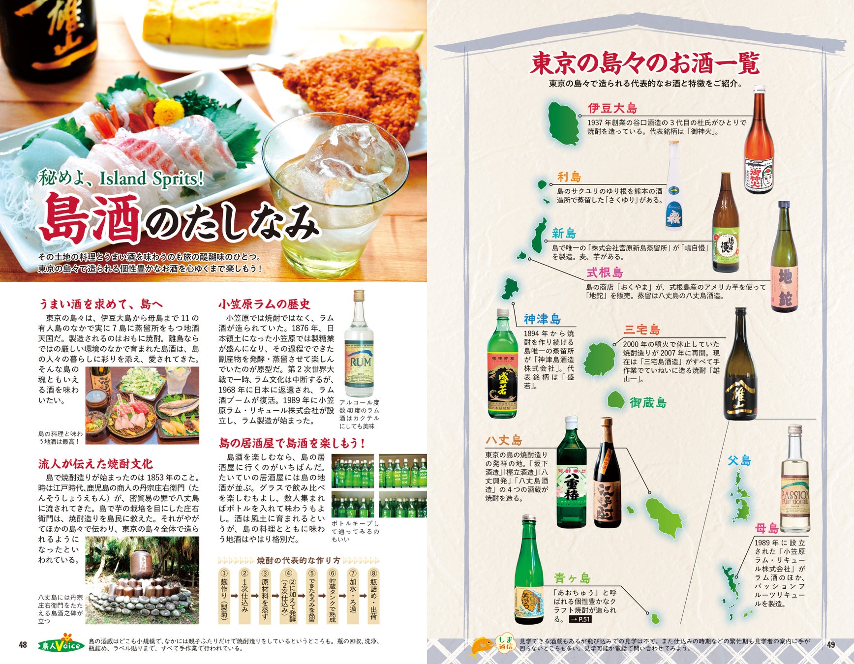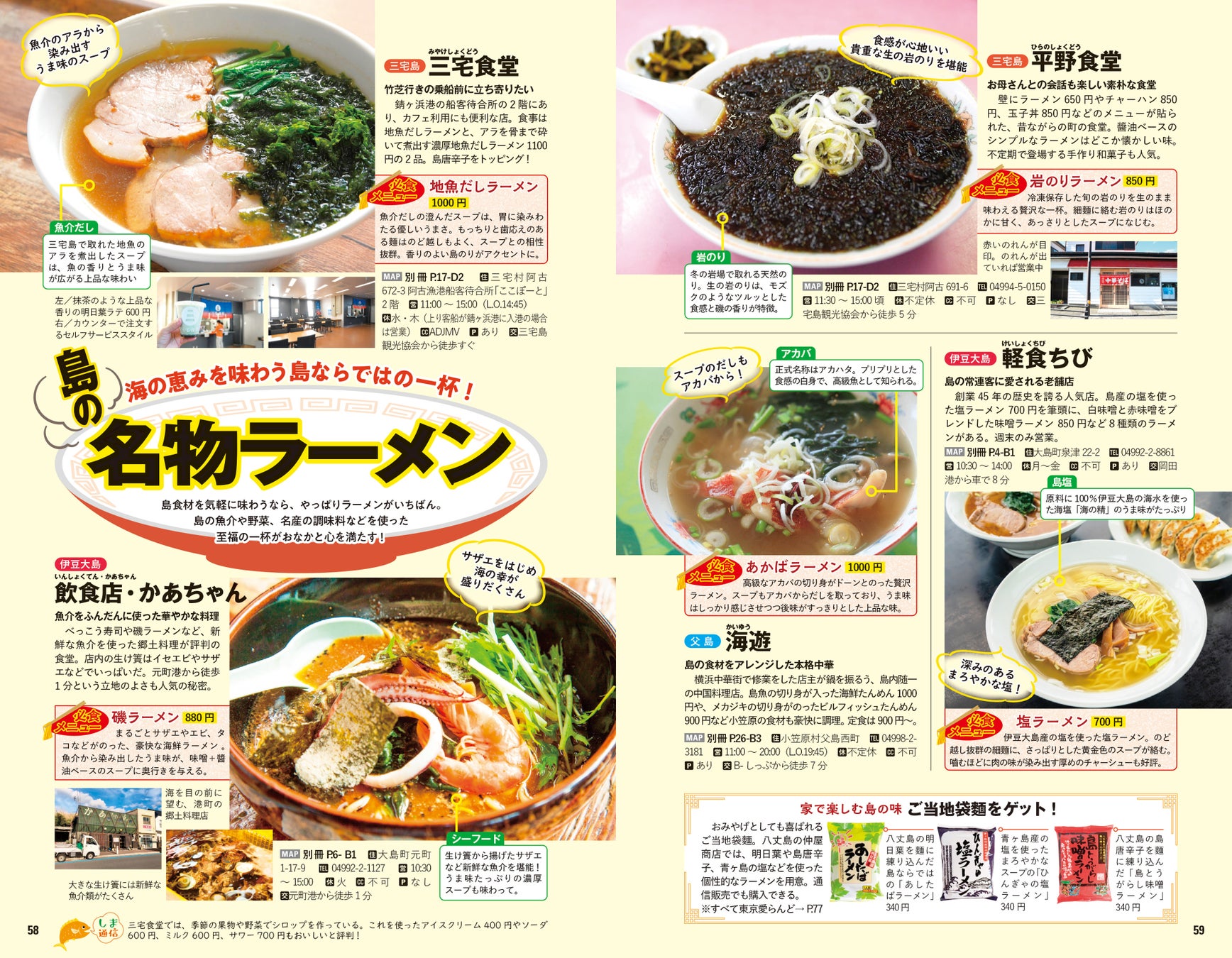 黒潮の影響を受け多様な魚が揚がる伊豆諸島、大物や高級魚に恵まれた小笠原諸島、どちらも新鮮な魚介が魅力の島の絶品グルメも総特集。海の恵みをたっぷり味わえる島のご当地ラーメンや、個性豊かなお酒、島野菜やフルーツまで、お腹と心が満たされる逸品を揃えました。