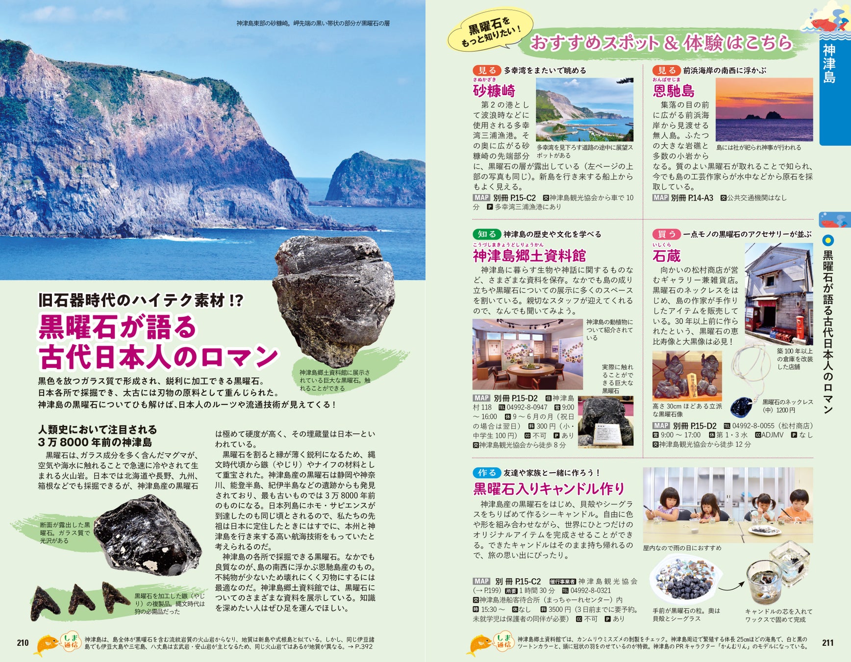 島ごとの特徴や、歩き方、アクセス情報、観光スポットは充実のエリアガイドで徹底解説。交通網が限られている島だからこそ、それぞれの島でのおすすめの廻り方や旅の前に予約しておくべき事柄などをしっかりガイドしています。編集部おすすめの各島&複数の島を巡るモデルプランや、取材先で知りえたコラムやはみだしネタもたっぷり掲載。