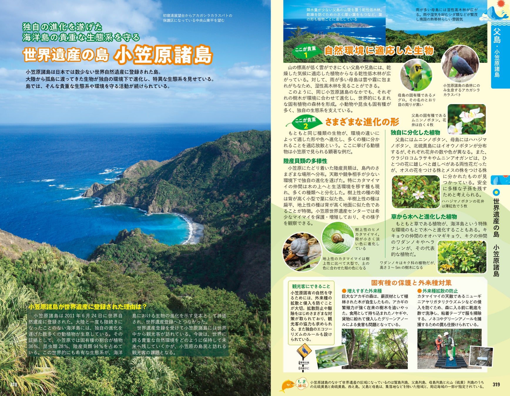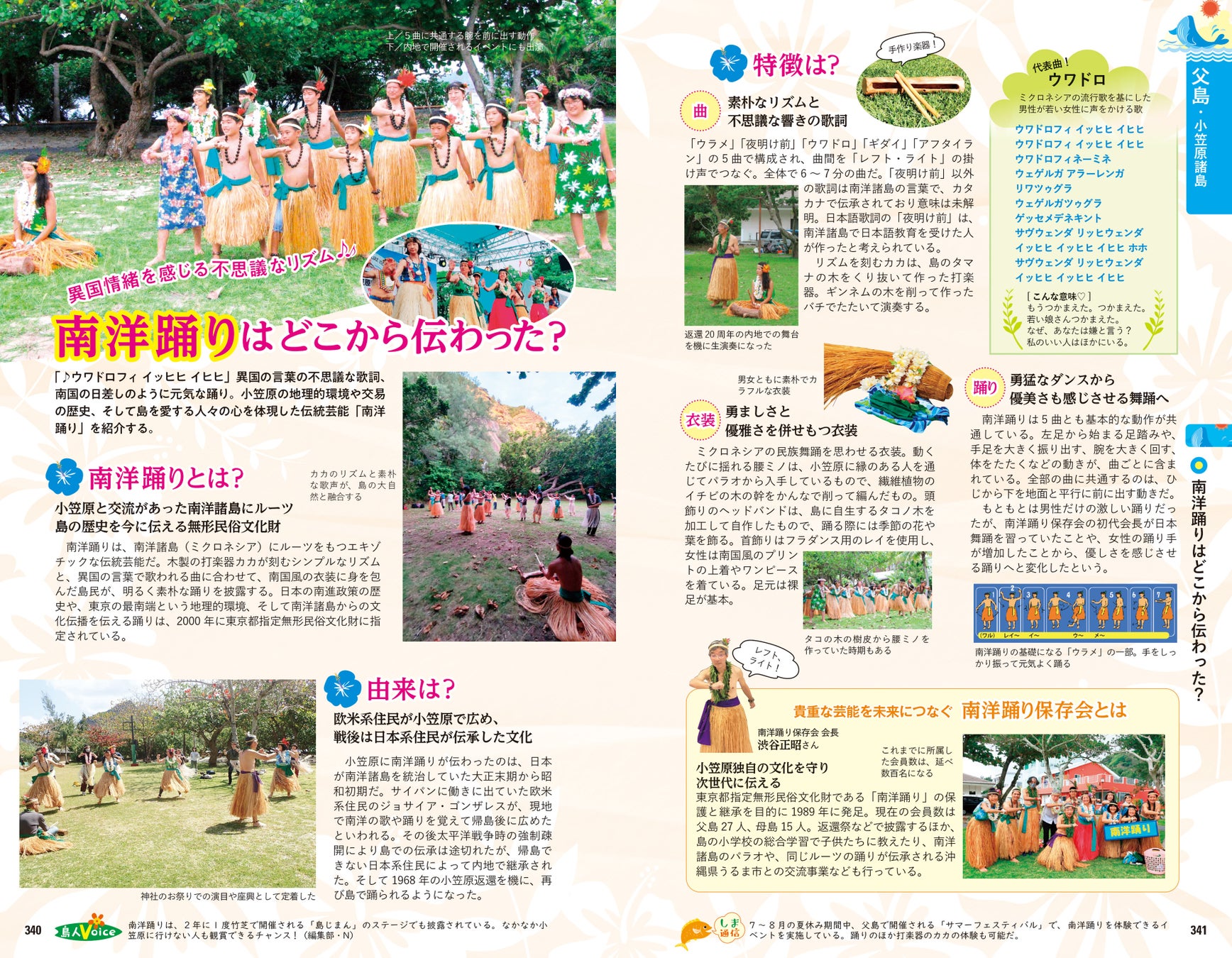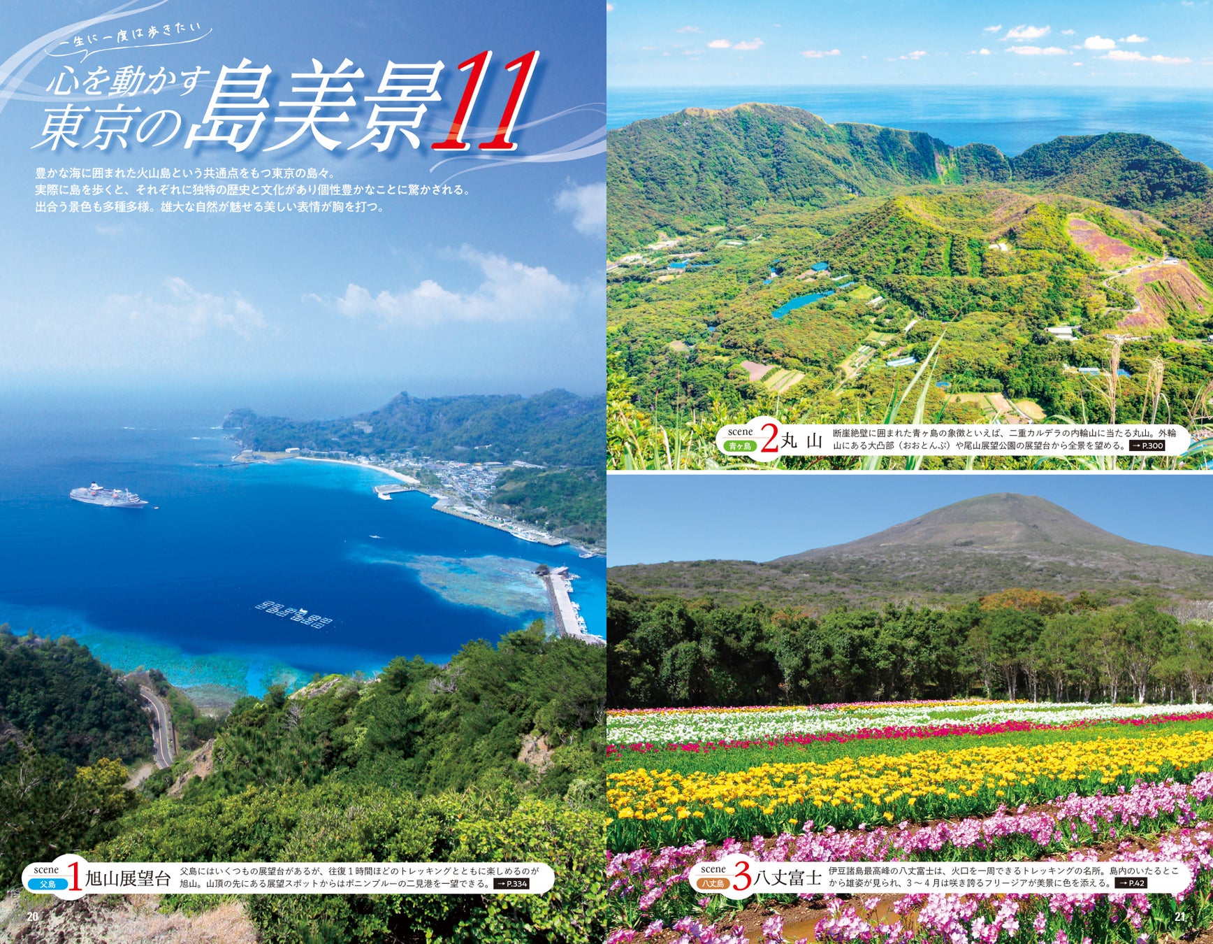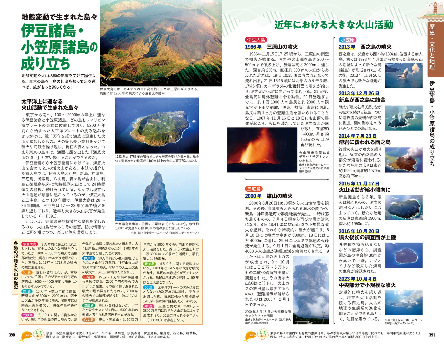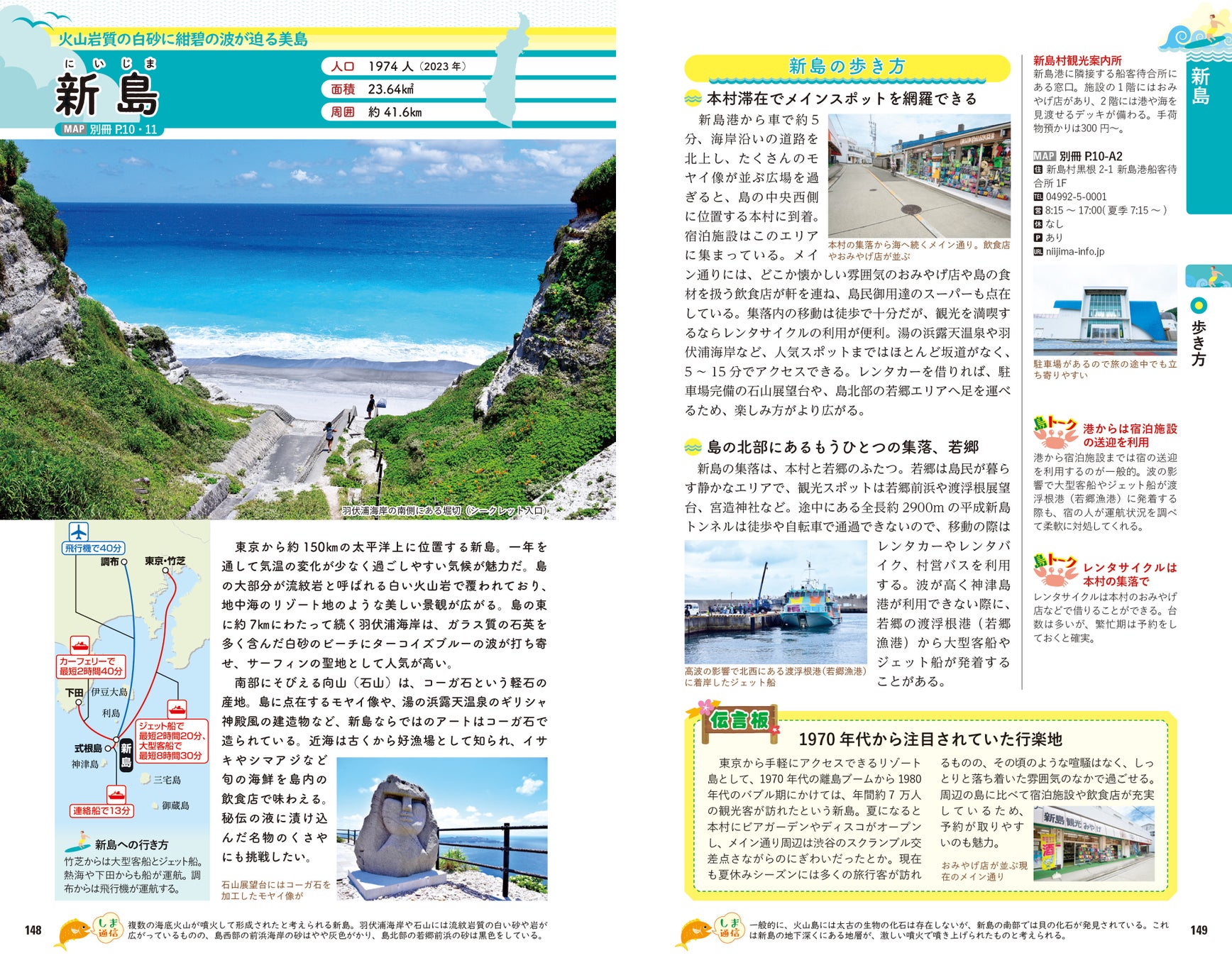 大海原に囲まれ、内陸との距離がある島々では固有の風土が多数息づいています。流刑地とされていた時代の背景や、独自の神話・伝説、情熱あふれる太鼓文化や、南洋踊り・フラまで、歴史・文化の読み物を多数掲載。世界遺産にもなった小笠原の生態系や、各島で見られるイルカ・クジラの解説、島の起源と火山の歴史から、おもな岩石の紹介まで、もはやガイドブックの域を超えて旅の教科書としても活用いただける充実の内容です。