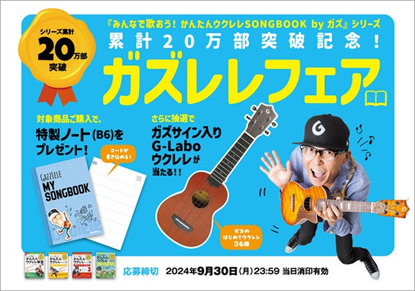 「ガズレレ」とは“音楽を聴くのはサイコーだけど、やるのはもっとサイコー!”をコンセプトに、音楽初心者向けにウクレレレッスン動画を日々公開しているYouTubeチャンネル。同チャンネルの連動ムックとして、8月17日発売の『みんなで歌おう! かんたんウクレレSONGBOOK 6 by ガズ』を含め、過去11冊が刊行され、いずれもベストセラーとなっています。今回の「ガズレレフェア」では、開催店で対象商品を購入した方に、「特製ノート(B6)」を贈呈。さらに、抽選で合計3名様に、ガズサイン入りG-Laboウクレレ「ガズのはじめてウクレレ」をプレゼントします!(特典の特製ノートはなくなり次第終了となります。)