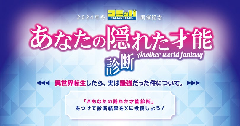 株式会社カードラボ ゲーマーズ(本社:東京都豊島区、https://www.gamers.co.jp/ 以下ゲーマーズ)は、2024年12月12日(木)10時より『2024年冬コミッパ開催記念「あなたの隠れた才能診断」異世界転生したら、実は最強だった件について。』を開催することをお知らせいたします。