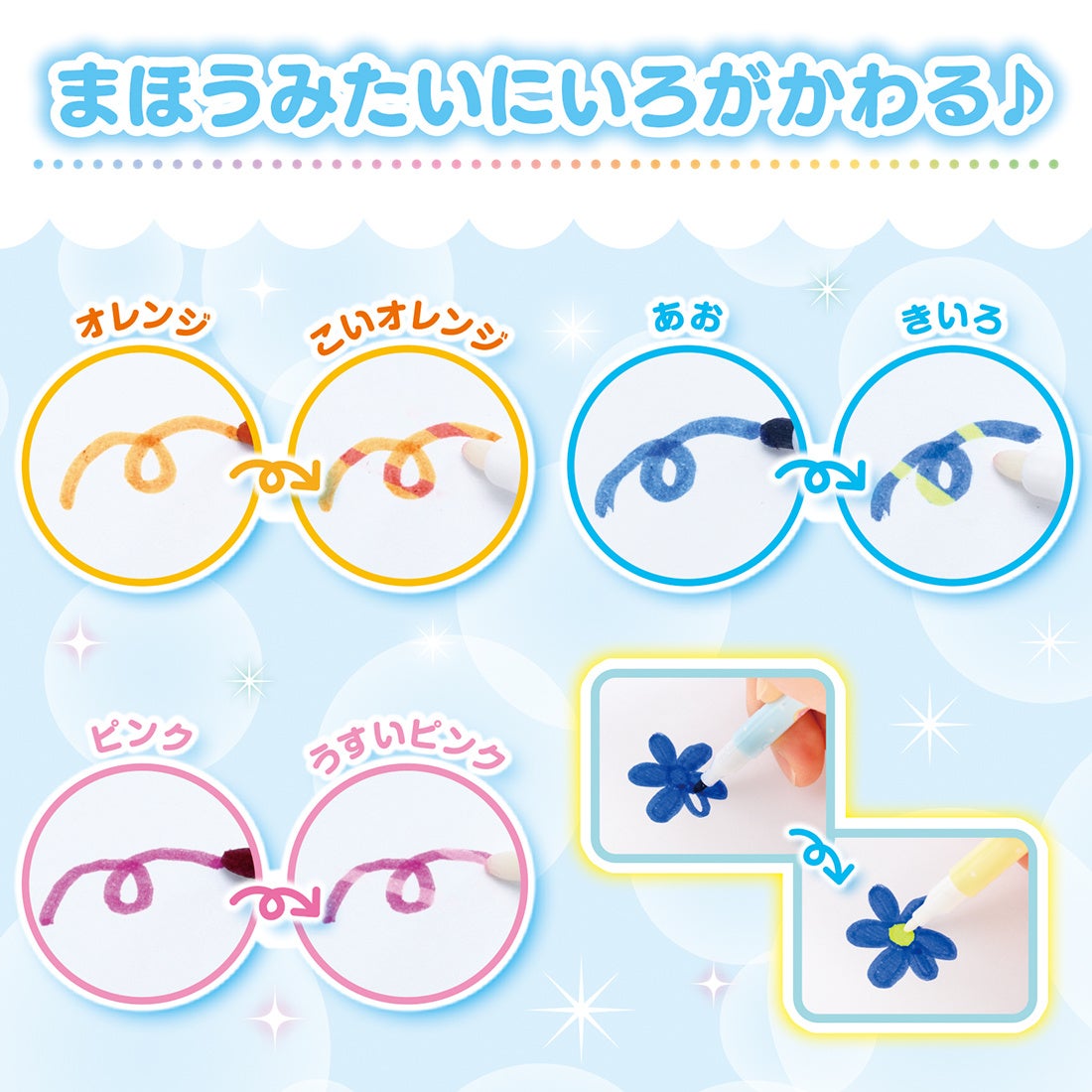 まほうペンは、カラーペン3本に、とうめいインクのペン1本のセット。カラーペンでおえかきをして、とうめいインクのペンでなぞると、オレンジはこいオレンジに、あおはきいろに、ピンクはうすいピンクにかわります!