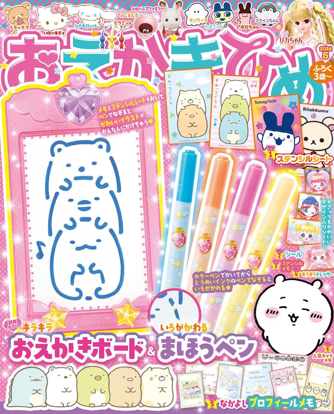 おえかきひめは、付録だけではなく本誌も超豪華。5月号は、シールであそべる「キラキラ★ きねんしゃしんコーディネート」、おうちのおりがみでつくる「ドレスのおりがみレター」、おえかきやぬりえでおしゃれを楽しむ「プリンセスタウンで! かいて、ぬってだいへんしん♥」など、楽しい記事が盛りだくさんです。キャラクターページでは、「ピクミン」、「オバケーヌ」、「アポロちゃん」、「セボンスター」が初登場! 他にも、「リカちゃん」、「シルバニアファミリー」、「コウペンちゃん」など、大人気キャラクターたちの遊びページもたっぷり! 一冊まるごと遊び尽くせるおえかきひめを、是非楽しんでください!