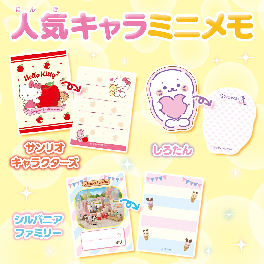 切り取って使える人気キャラのミニメモ。ハローキティ、シナモロール、マイメロディ、のメモが1枚ずつ、シルバニアファミリーのメモが3枚、しろたんのダイカットメモが3枚の合計9枚です。