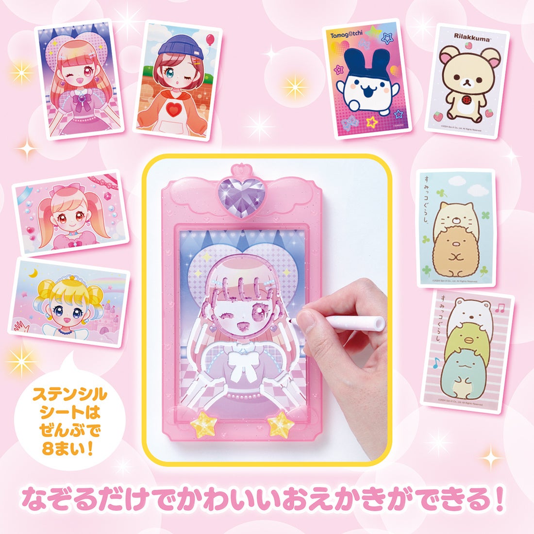 とじこみふろくのメモとステンシルシートをおえかきボードにセットして、ペンでなぞると……簡単にかわいいえがかけます! ステンシルシートは全部で8まいです。