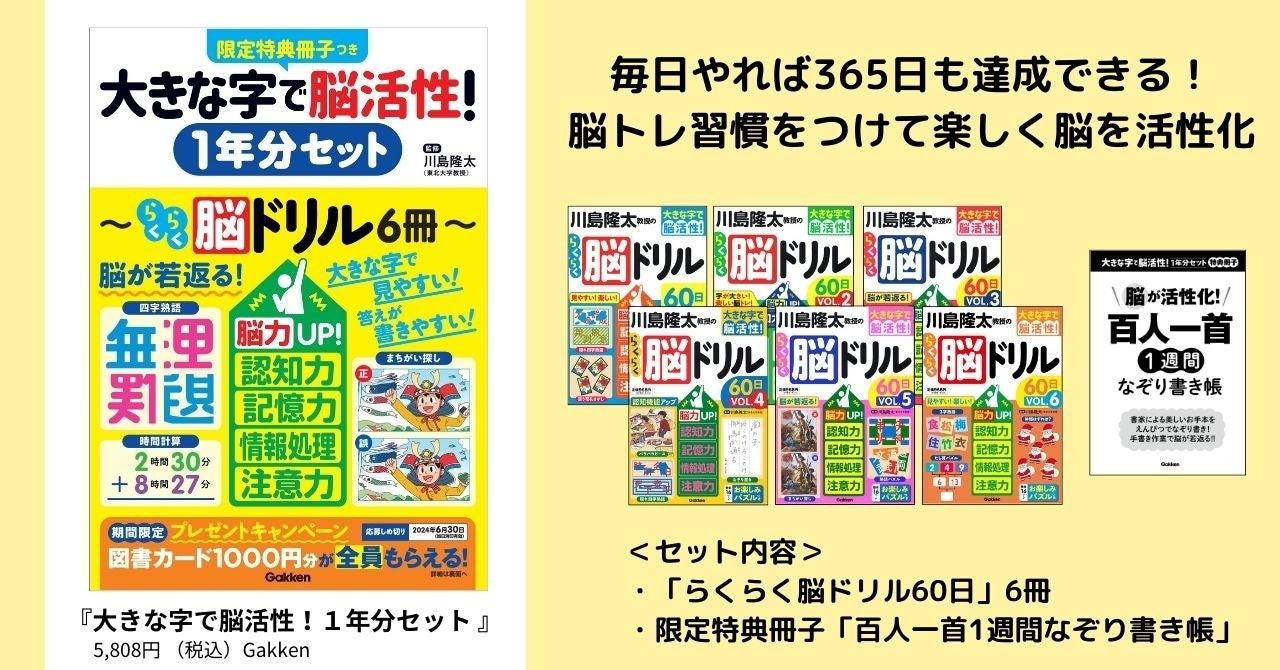 株式会社 学研ホールディングス(東京・品川/代表取締役社長:宮原博昭)のグループ会社、株式会社 Gakken(東京・品川/代表取締役社長:五郎丸徹)は、らくらく脳体操シリーズ6冊と限定特典冊子がセットになった『大きな字で脳活性!1年分セット』を2024年3月22日(金)に発売しました。