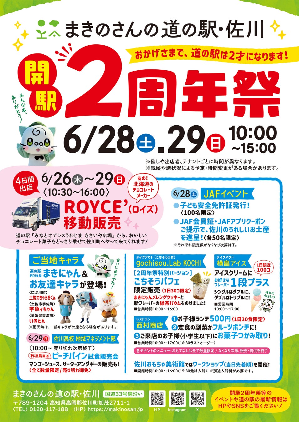 「まきのさんの道の駅・佐川」では、開駅から2年を迎えることを記念して、6月28日(土)・29日(日)の2日間にわたり「開駅2周年祭」が開催されます。ご当地キャラの登場やテナントからの2周年限定メニュー等、楽しい催しが盛りだくさん!グルメやハンドメイドのお店が集まる「さかわでマルシェ」(雨天中止)も!