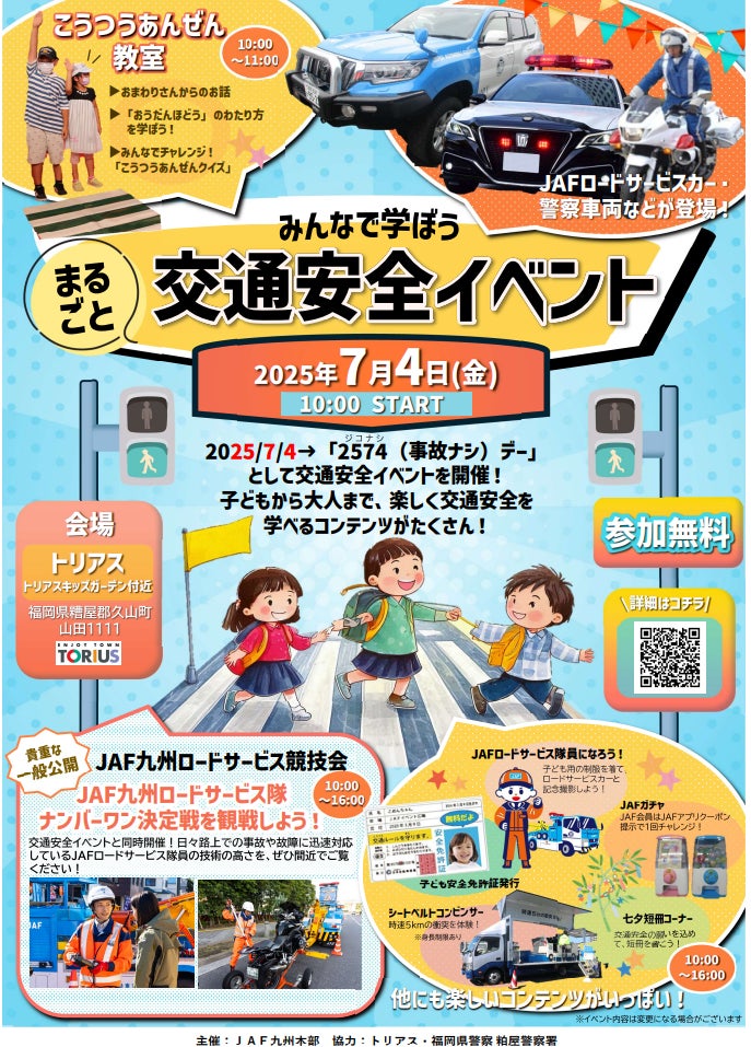JAF九州本部(本部長 金野 誠)は7月4日(金)、トリアス(福岡県久山町)にて子どもから大人まで楽しめる「みんなで学ぼう!まるごと交通安全イベント」を開催します。