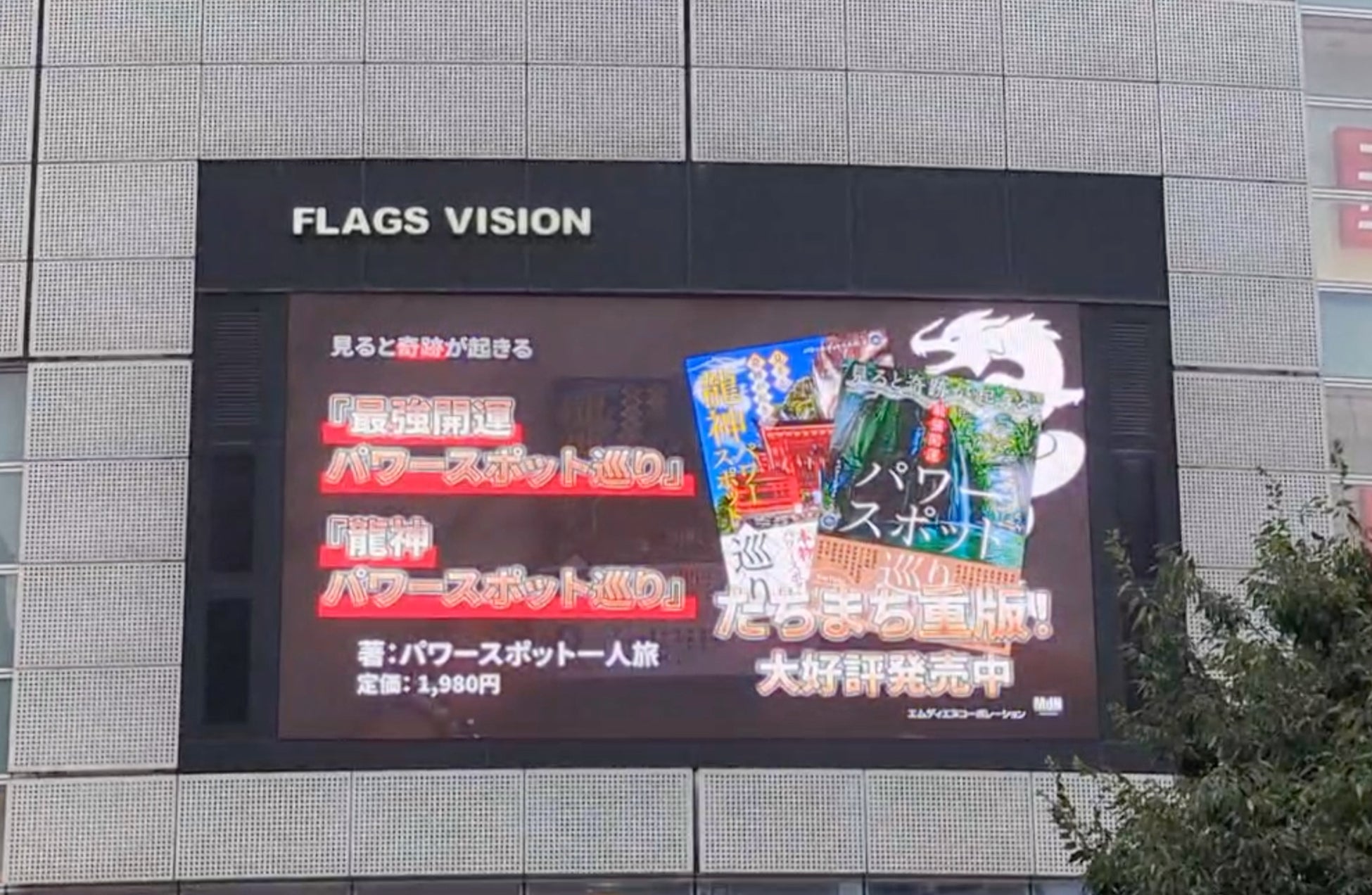 新宿駅の南口エリアでひときわ目を引く屋外大型ビジョン「FLAGS VISION」に、本書『見ると奇跡が起きる龍神パワースポット巡り』と、シリーズ第一弾の『見ると奇跡が起きる 最強開運パワースポット巡り』の動画が下記の日程で放映されます。
