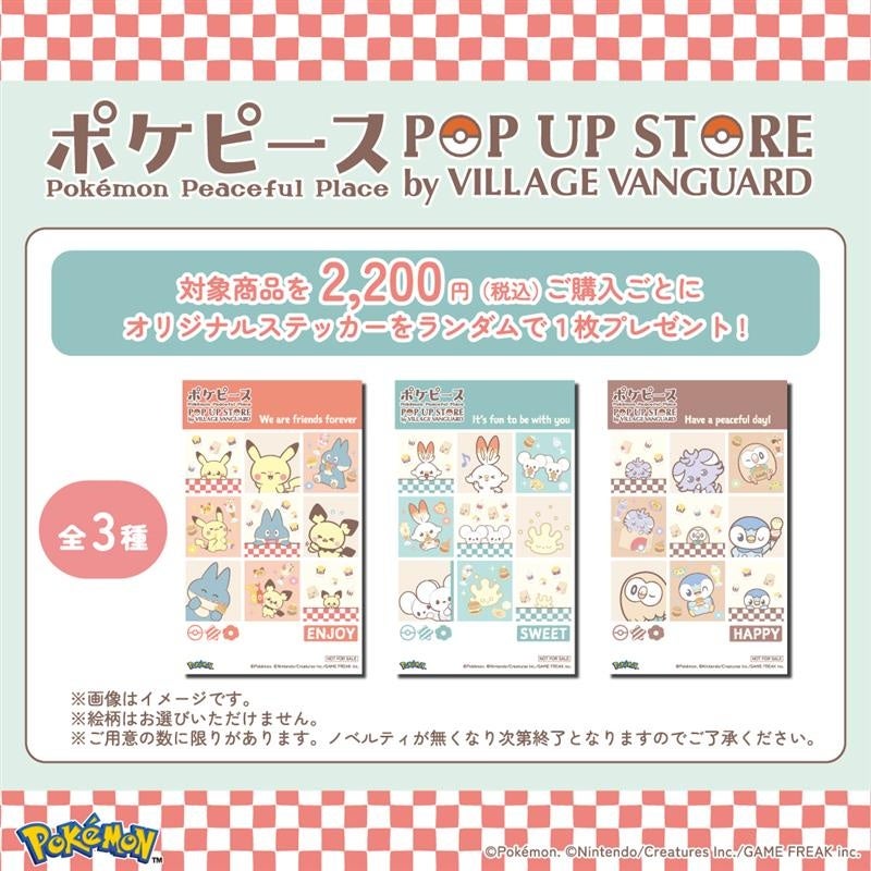 「ポケピース POP UP STORE by VILLAGE VANGUARD」において、「ポケピース」商品を2,200円(税込)お買い上げごとに、オリジナルステッカー(全3種)をランダムで1枚プレゼントいたします。