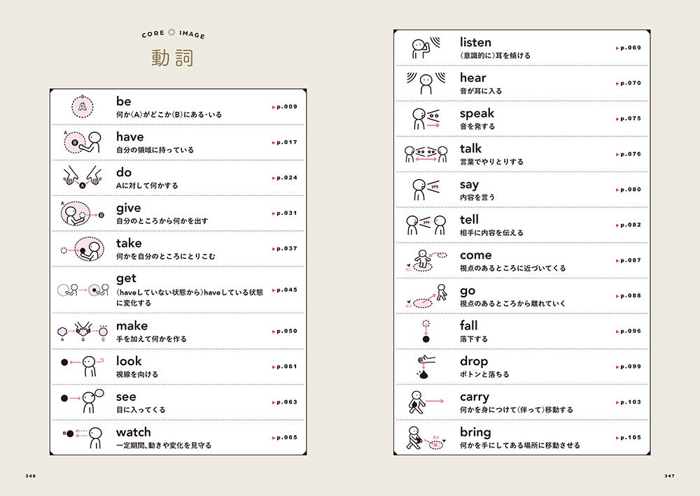 本シリーズでは、「コア」をイメージしやすいように、イラスト図解をたっぷり使っています。ビジュアルで理解することで、ただの丸暗記じゃない、イキイキとした英語を身につけましょう。英語を改めて学び直したい方にも、学生の副読本にも最適です。