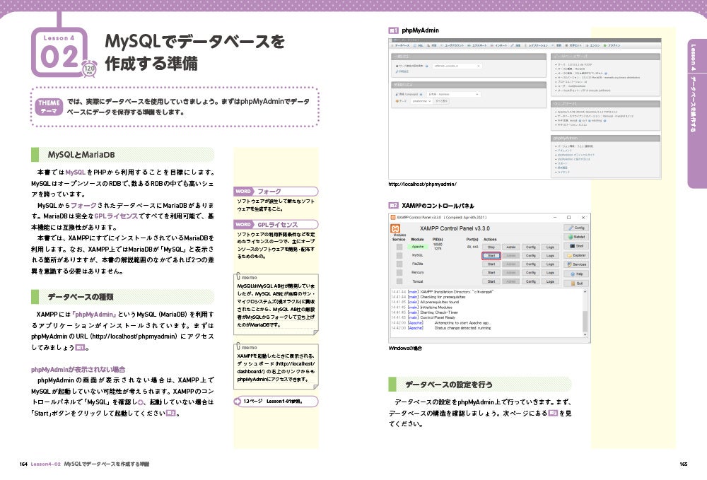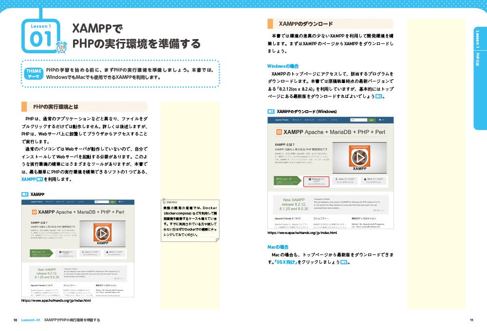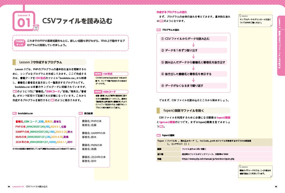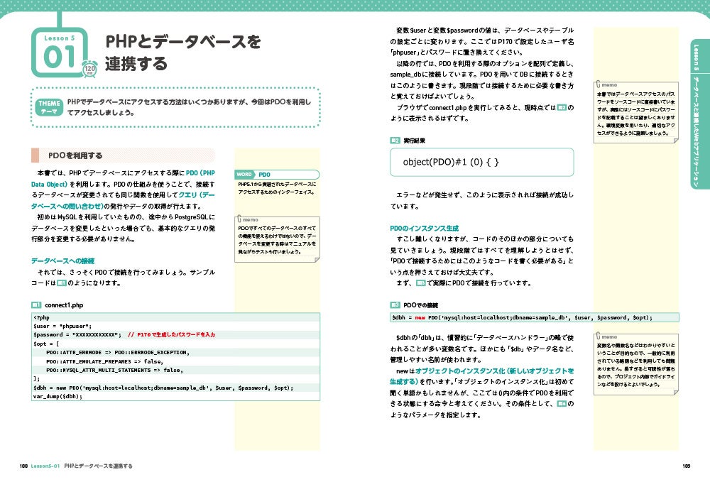 変数、演算子、条件分岐、配列、ループ処理といったPHPの基本的な文法と使い方をマスターしたあと、シンプルなWebアプリケーションを作成しながら、PHPプログラミングの考え方と書き方を実践的に学んでいくことができます。