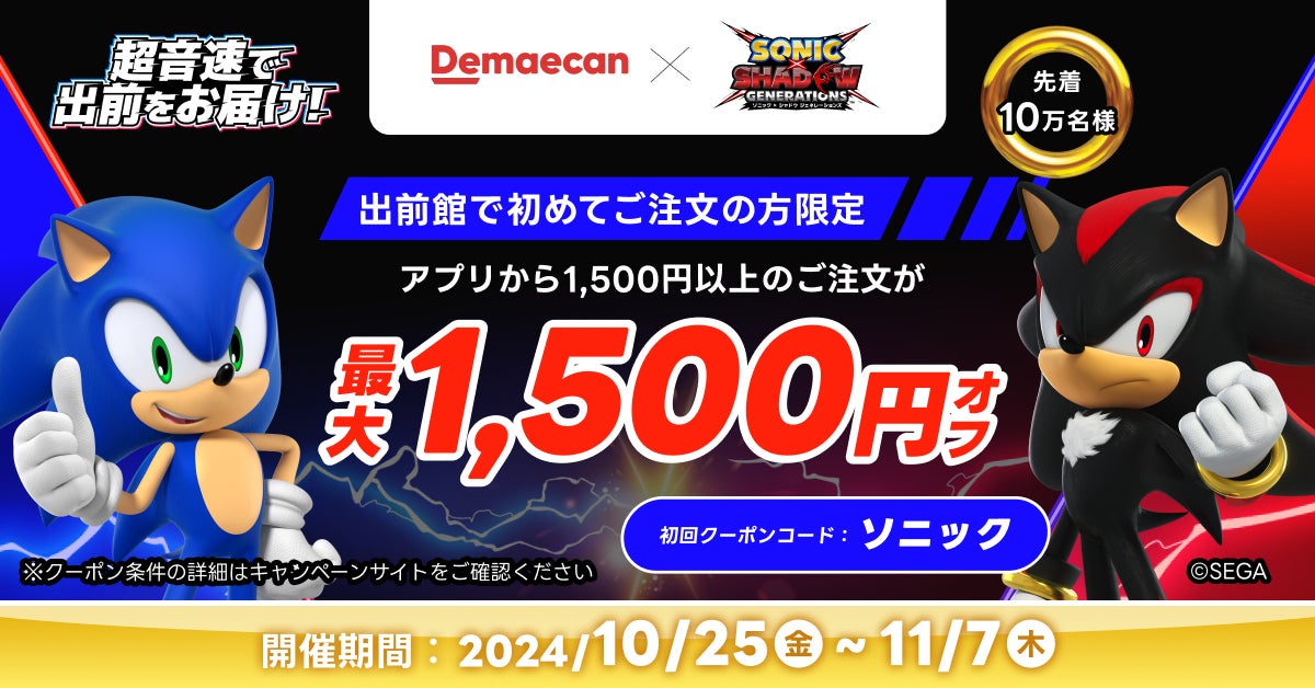株式会社出前館が運営する日本最大級のデリバリーサービス『出前館』は、株式会社セガより本日発売のゲームソフト「ソニック × シャドウ ジェネレーションズ」とのコラボキャンペーン「超音速で出前をお届け!」を、2024年10月25日(金)から11月7日(木)に開催いたします。