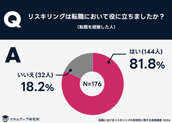 実際にリスキリングを行い、その後転職を果たした人にリスキリングが実際に転職において役立ったかを尋ねたところ、リスキリングを経験し転職も果たした人の81.8%が「はい」と回答し、リスキリングの転職における有効性が証明された。