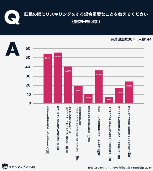 リスキリングを転職に役立てるうえで重要なポイントを尋ねたところ、「自分の興味や強みに合った分野を選ぶ」ことが56.3%と最多の回答となった。