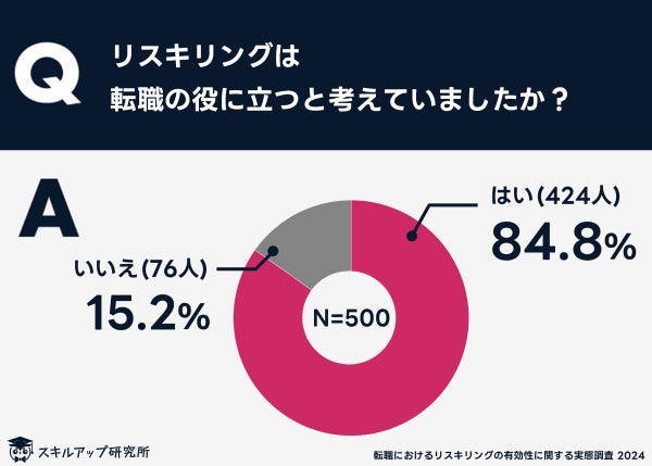 リスキリングを行った人々に「リスキリングは転職の役に立つと考えていましたか?」と尋ねたところ、84.8%もの人が「はい」と答えた。