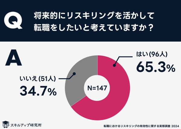 リスキリングを行ったものの現時点では転職していない人々に対し、「将来的にリスキリングを活かして転職したいか」を尋ねた結果、65.3%が「はい」と回答していた。