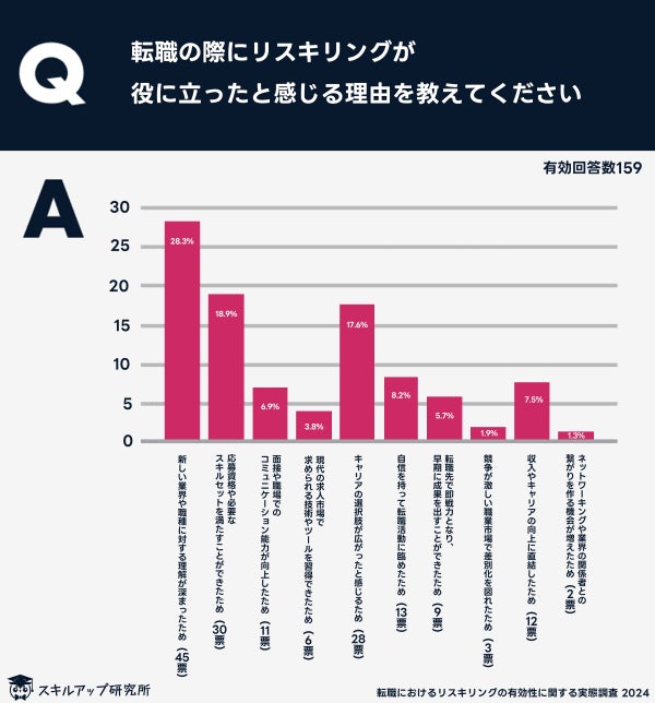 リスキリングが転職の際に役立った理由として、最も多かったのが「新しい業界や職種に対する理解が深まったため」であり、28.3%の人が回答した。