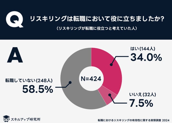 本調査で明らかになったのは、リスキリングを行った人の中で実際に転職を果たした層は34.0%にとどまり、58.5%もの人がリスキリングをしながらも転職していない実態であった。