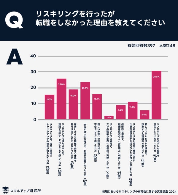 リスキリングを行いながらも転職をしなかった最多の理由は、「リスキリングが必ずしも転職を目的としていなかったため」であり、30.6%を占めていた。