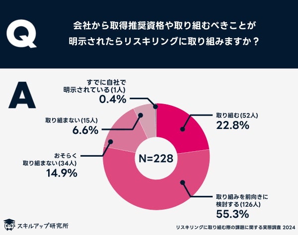 会社からリスキリングで取得すべき資格や取り組むべきことが明示されれば、約8割の人がリスキリングに「取り組む」または「取り組みを前向きに検討する」と回答した。この結果は、具体的な指針が示されるだけで、リスキリング実施率が大幅に向上する可能性を示唆している。