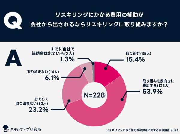 会社からリスキリングの費用補助があるならば、7割近くの人々が「取り組む」または「取り組みを前向きに検討する」ことが分かった。