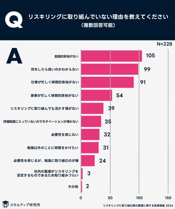 リスキリングに取り組んでいない理由を尋ねた調査では、およそ半数近くの人が「金銭的余裕がない」と回答した。次いで多かった回答は「何をすべきかわからない」と「仕事が忙しすぎて時間がない」であった。