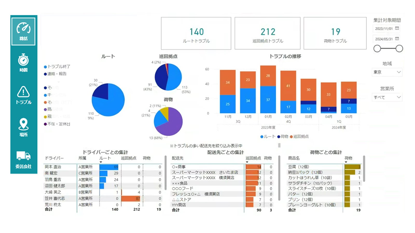 3. ドライバーの荷待ちや付帯作業、配送先や荷物単位のトラブルの集計が可能
