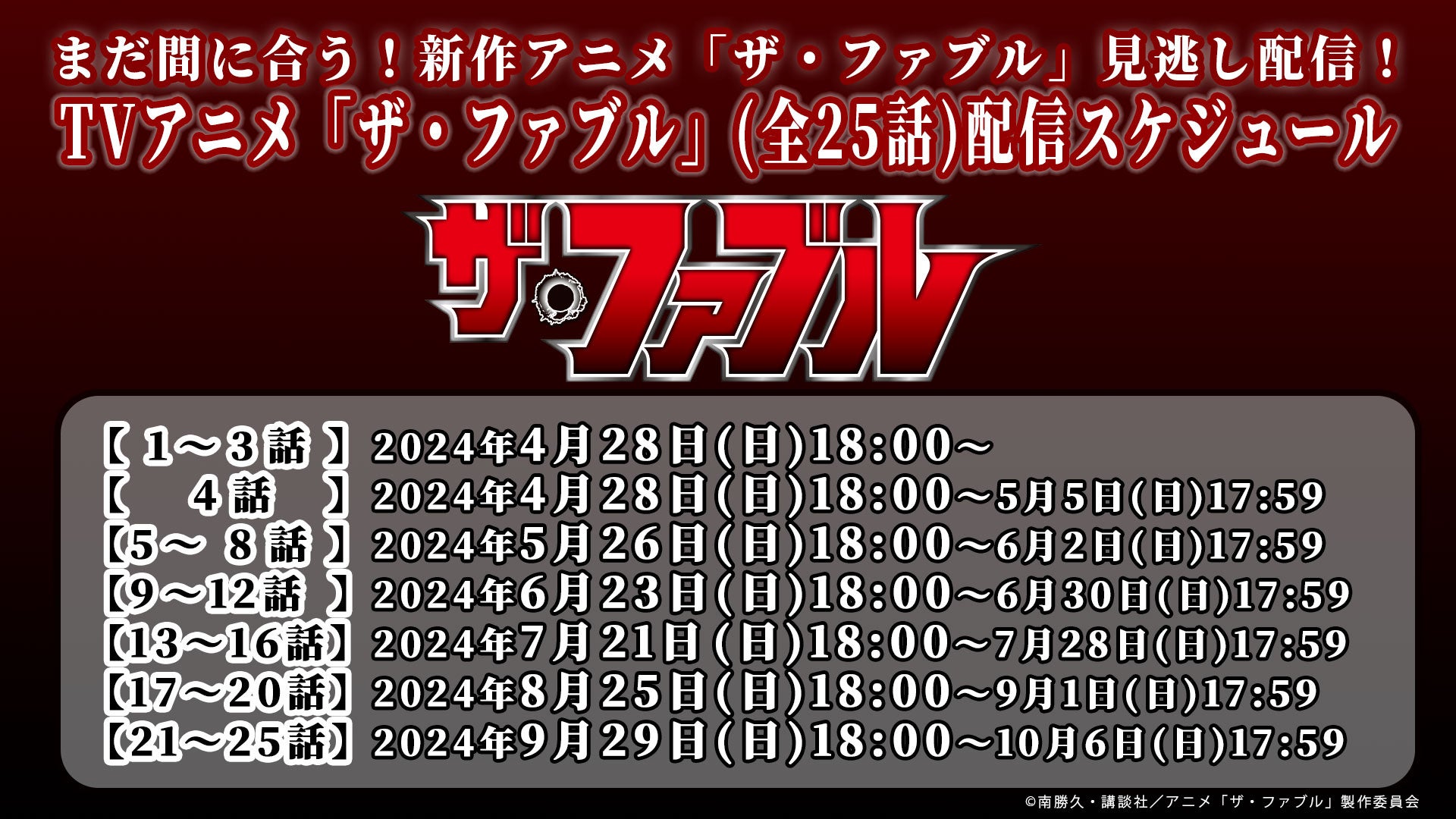 TVアニメ『ザ・ファブル』が4月6日より日本テレビ系にて順次全国放送中!これを記念して、講談社が運営するYouTubeチャンネル「フル☆アニメTV」にて、TVアニメ『ザ・ファブル』全25話を期間限定で無料見逃し配信いたします。【第1話~第4話】を本日4月28日18時から5月5日17時59分まで、【第5話~第8話】を5月26日18時から6月2日17時59分まで、【第9話~第12話】を6月23日18時から6月30日17時59分まで、【第13話~第16話】を7月21日18時から7月28日17時59分まで、【第17話~第20話】を8月25日18時から9月1日17時59分まで、【第21話~第25話】を9月29日18時から10月6日17時59分までの期間限定配信となりますので、ぜひお楽しみください!