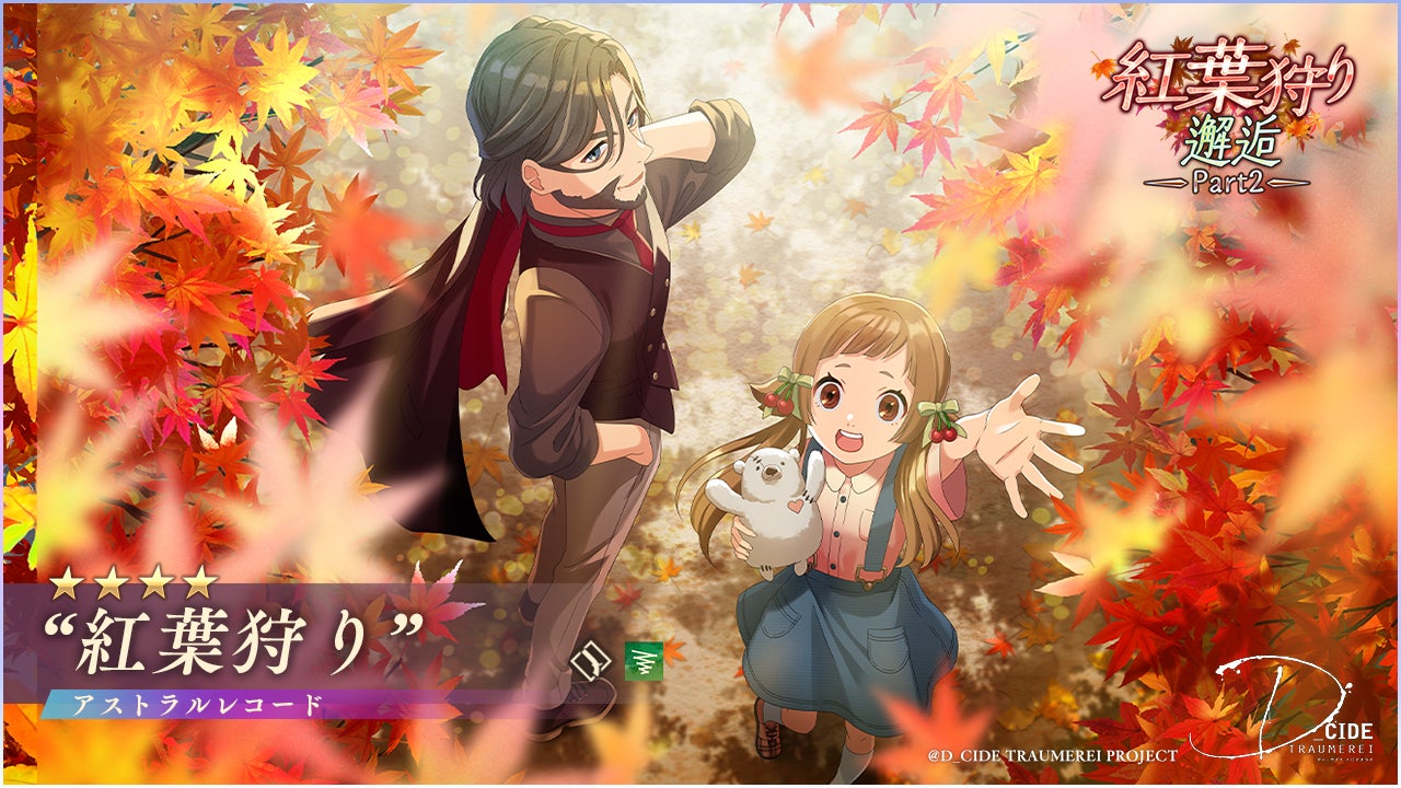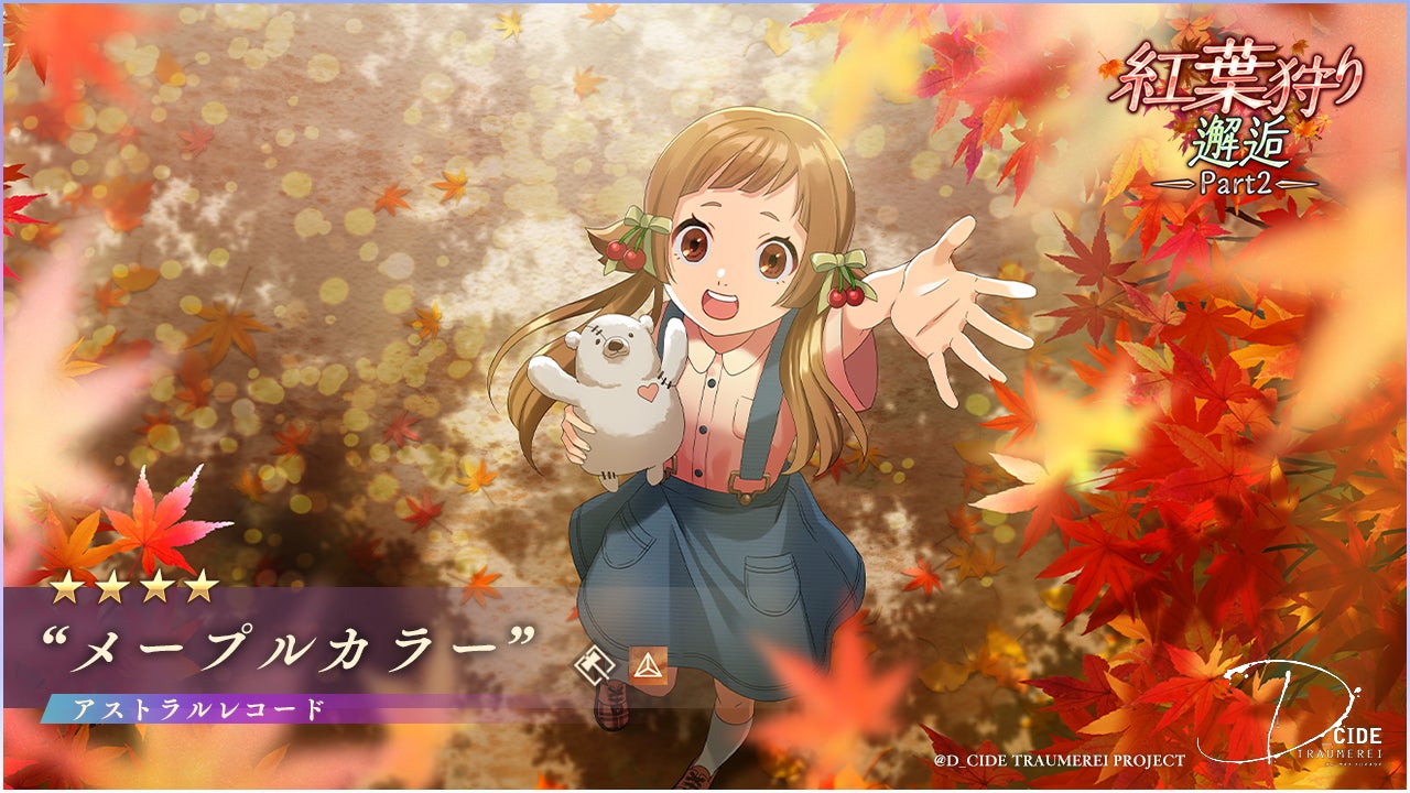 株式会社ブシロード(本社:東京都中野区、代表取締役社長:木谷高明)は、株式会社サムザップ(本社:東京都渋谷区、代表取締役:日高裕介)、株式会社ドリコム(本社:東京都品川区、代表取締役社長:内藤裕紀)と共同企画し、ライオンズフィルム株式会社(本社:東京都墨田区、代表取締役社長CEO:森健志)が運営するゲームアプリ「D_CIDE TRAUMEREI/ディーサイドトロイメライ」にて邂逅「紅葉狩り邂逅Part2」を開催いたします。