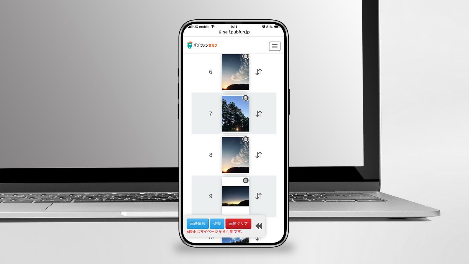イージーモードは、パブファンセルフがご用意する中でもっともお手軽に本を出版できる方法です。パソコンやスマートフォンに保存されている画像ファイル(jpeg形式)を順に並べてアップロードするだけで、1ページあたり1枚の画像が掲載されたオリジナルの本となり、Amazonや楽天ブックスで販売することができます。シンプルな手順と操作で、パソコンやスマホに不慣れな方を中心にご好評いただいています。