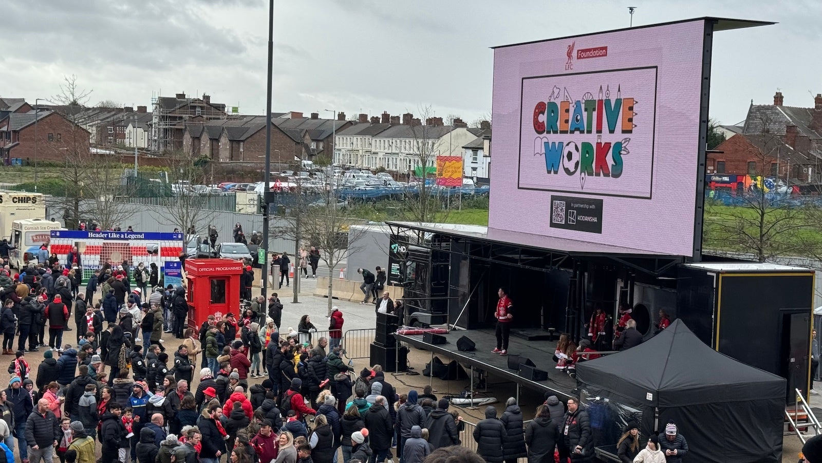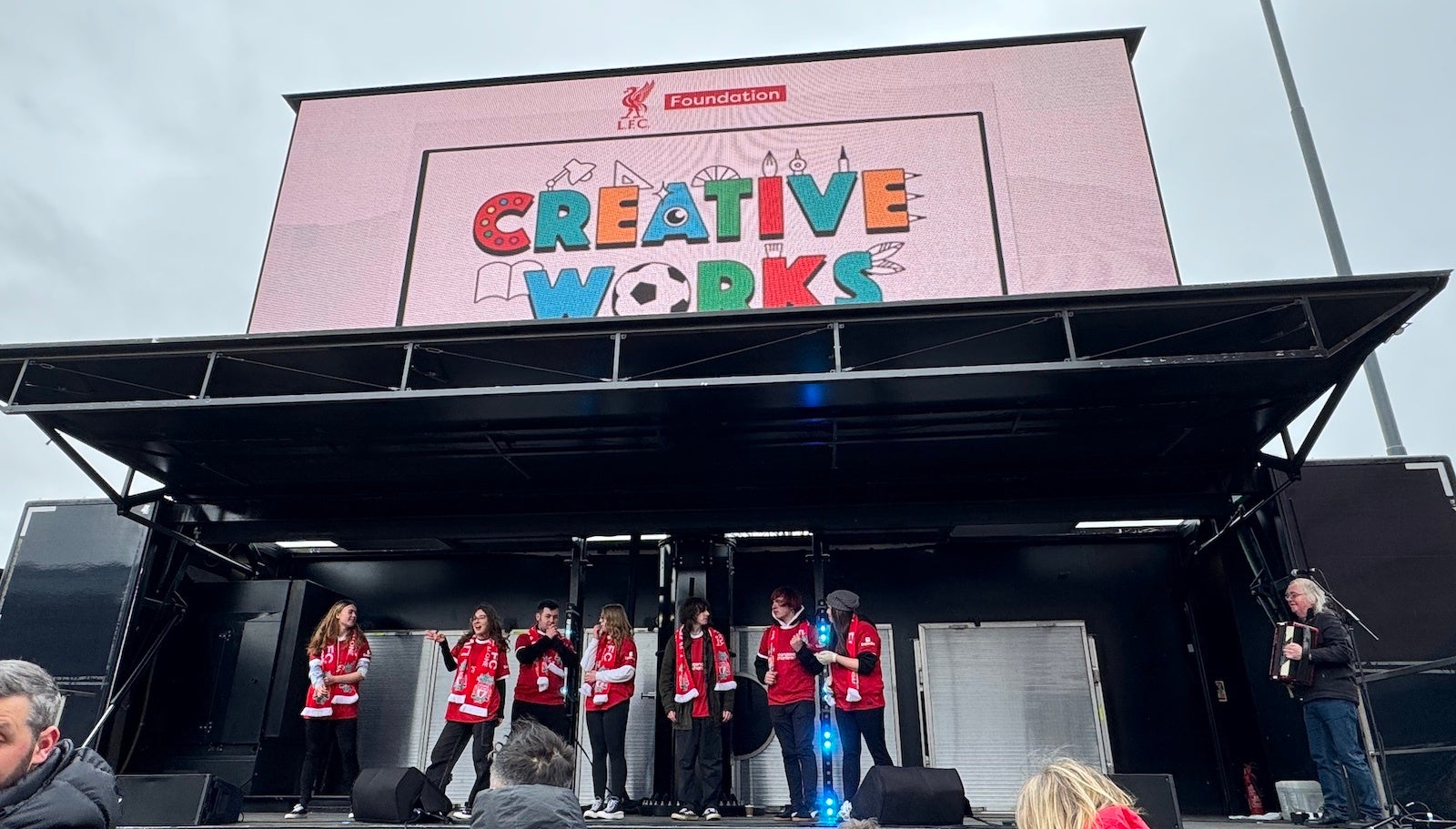 このレジェンドマッチの日には、講談社とリバプール財団が共同で行う若者支援プログラム「クリエティブ・ワークス」の参加者たちが、リバプールFCの歴史をテーマにした自作の劇をスタジアム前のファンゾーンの舞台で発表。この活動を通じて、参加者たちは自己表現のスキルを磨き、その才能を発揮するための貴重な経験を積むことができました。