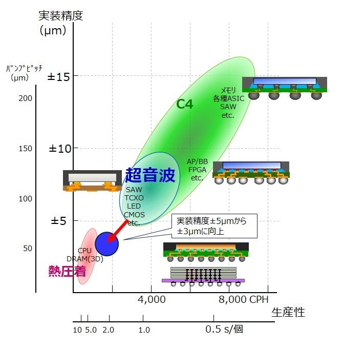・従来の超音波技術の実装精度±5 μmから±3 μmに向上し、FCBGA(フリップチップボールグリッドアレイ)やFCCSP(フリップチップチップサイズパッケージ)、光通信デバイスなどの次世代半導体パッケージングの高性能化・薄型化ニーズに応えます。