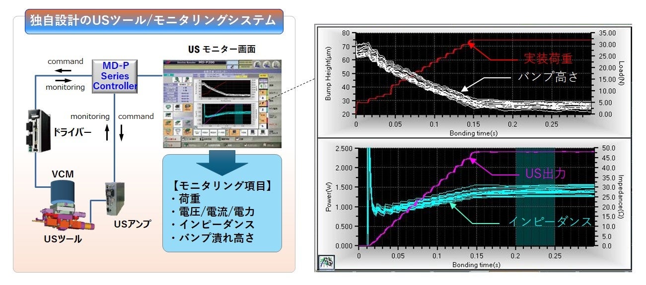 ・接合中の状態を常時監視し、荷重、電圧/電流/電力、インピーダンス、バンプ潰れ高さなどのプロセスの異常をリアルタイムでモニタリングできる機能により、安定した品質管理を実現します。