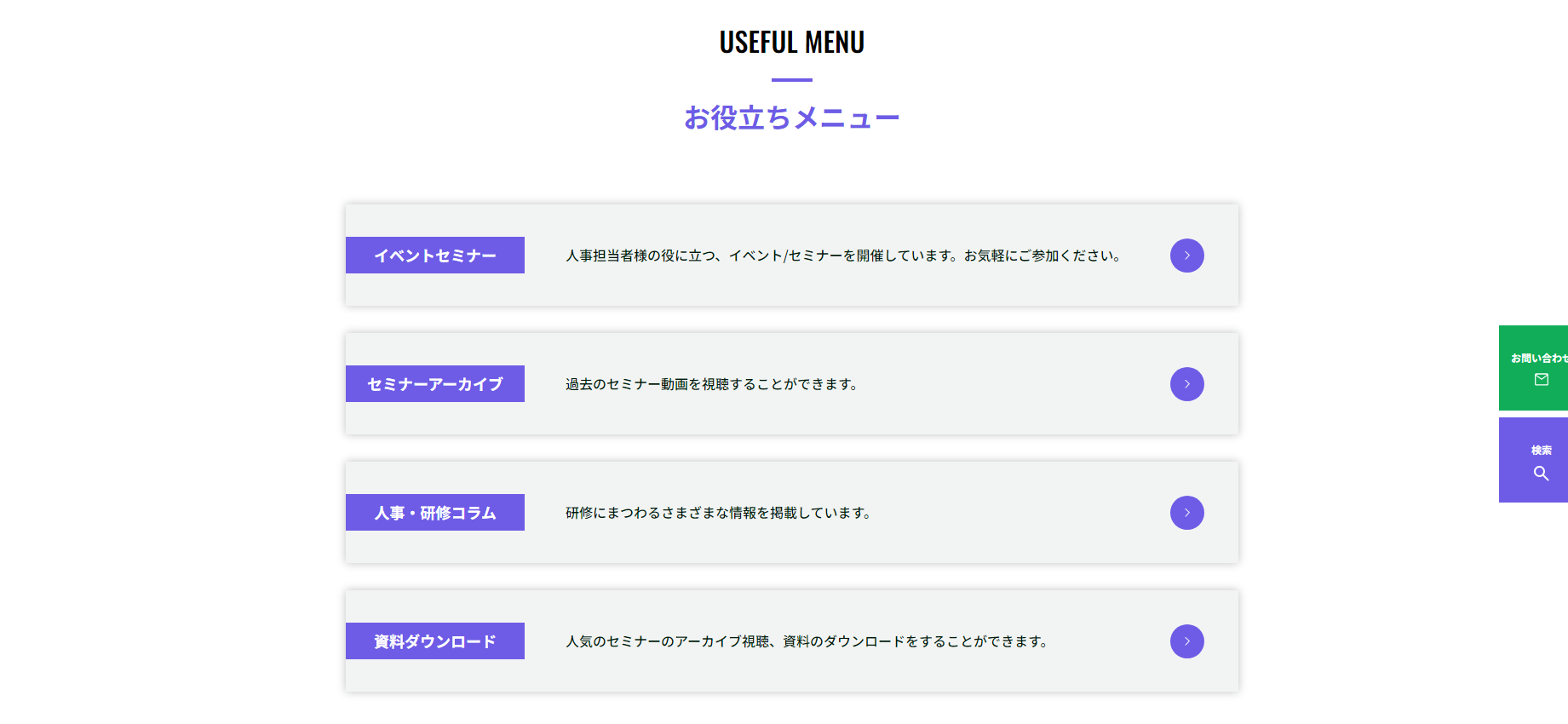 コーポレートカラーを取り入れたデザインのほか、ユーザビリティーの向上、さらには「人や組織」のお悩みや課題から解決策を検索できる機能など、すべての人事・研修ご担当者のみなさまのお役に立てるものと自負しております。