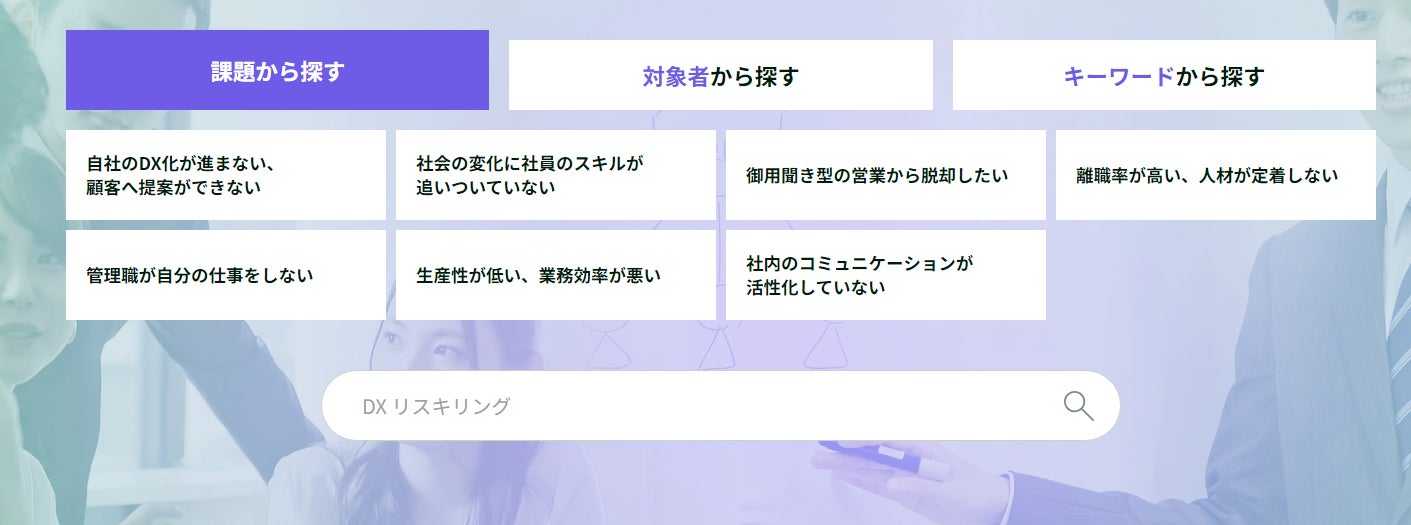 「課題」「対象者」「キーワード」「フリーワード」と、人事・研修担当者のみなさまが抱えるお悩みからもアプローチできる検索機能を設けました。