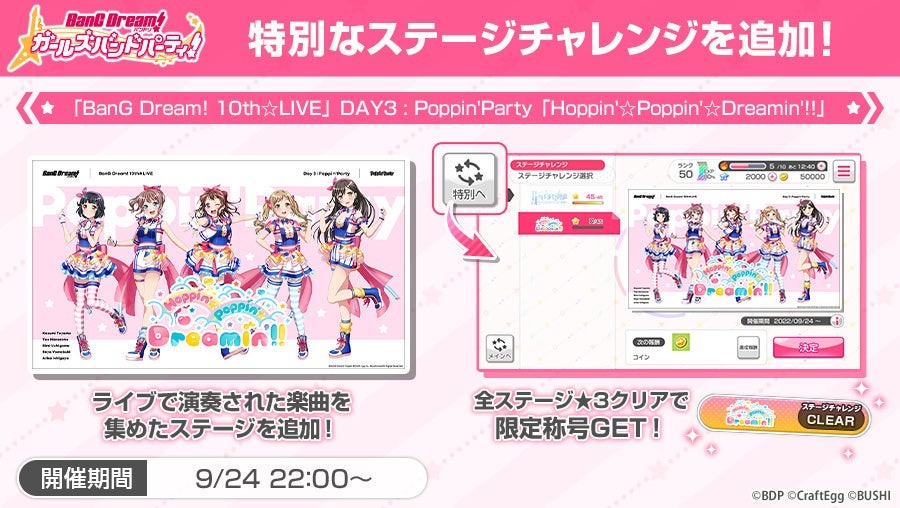 2022年9月24日(土) 22時より、「BanG Dream! 10th☆LIVE」DAY3 : Poppin'Party 「Hoppin'☆Poppin'☆Dreamin'!!」の開催を記念し、オリジナル楽曲「Moonlight Walk」をスマートフォン向けゲーム「バンドリ! ガールズバンドパーティ!」内に追加いたしました。
