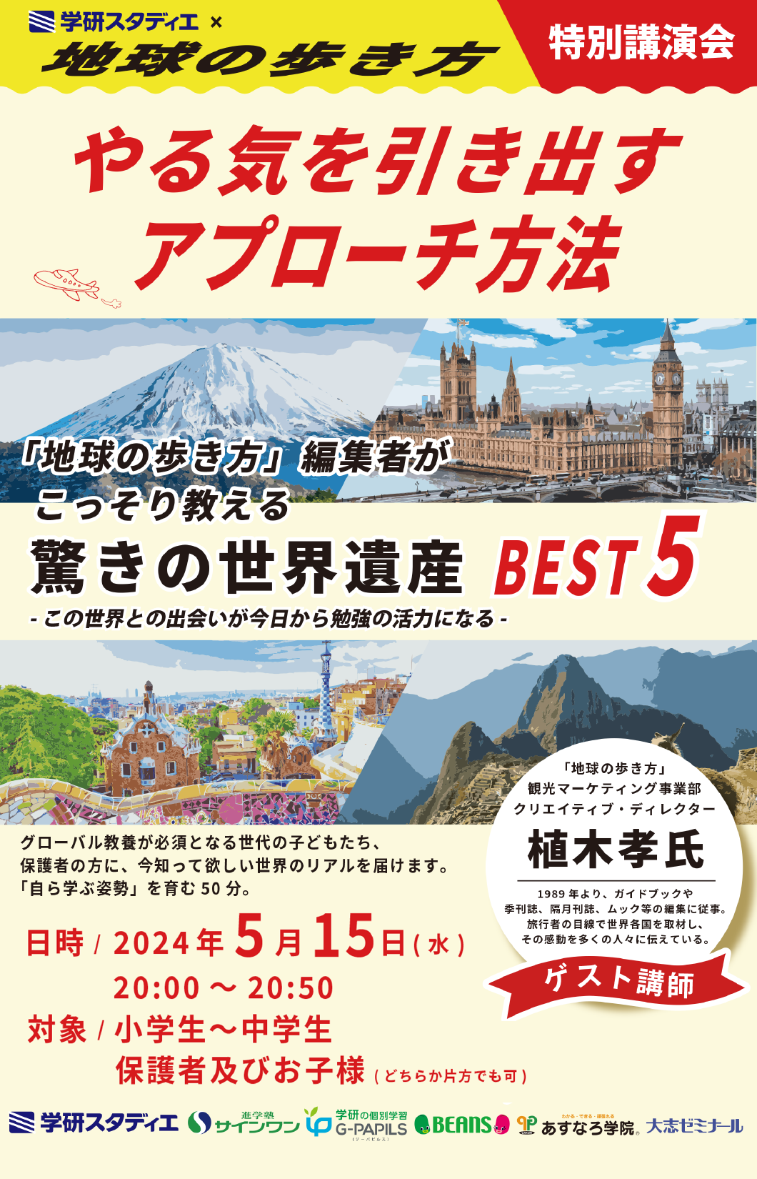 ますます進展するグローバル社会において、子ども達が大きく羽ばたけるきっかけづくりに、との想いで、5月15日に『地球の歩き方』とコラボした特別講演会を開催いたします。