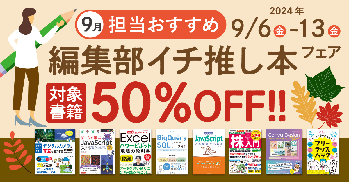 「この本をぜひ読んでほしい!」そんな編集者の熱い気持ちをお届けする、お得な電子書籍セール「担当おすすめ!編集部イチ推し本フェア」。インプレスブックスで販売している電子書籍を対象として50%オフで販売いたします。IT、デザイン、ビジネス、写真撮影など、幅広いジャンルから毎月、編集者の「今だからこそおすすめしたい良書」をご紹介していきます。おすすめポイントをまとめた編集者のコメントも掲載しておりますので、ぜひ購入の参考にしてください。