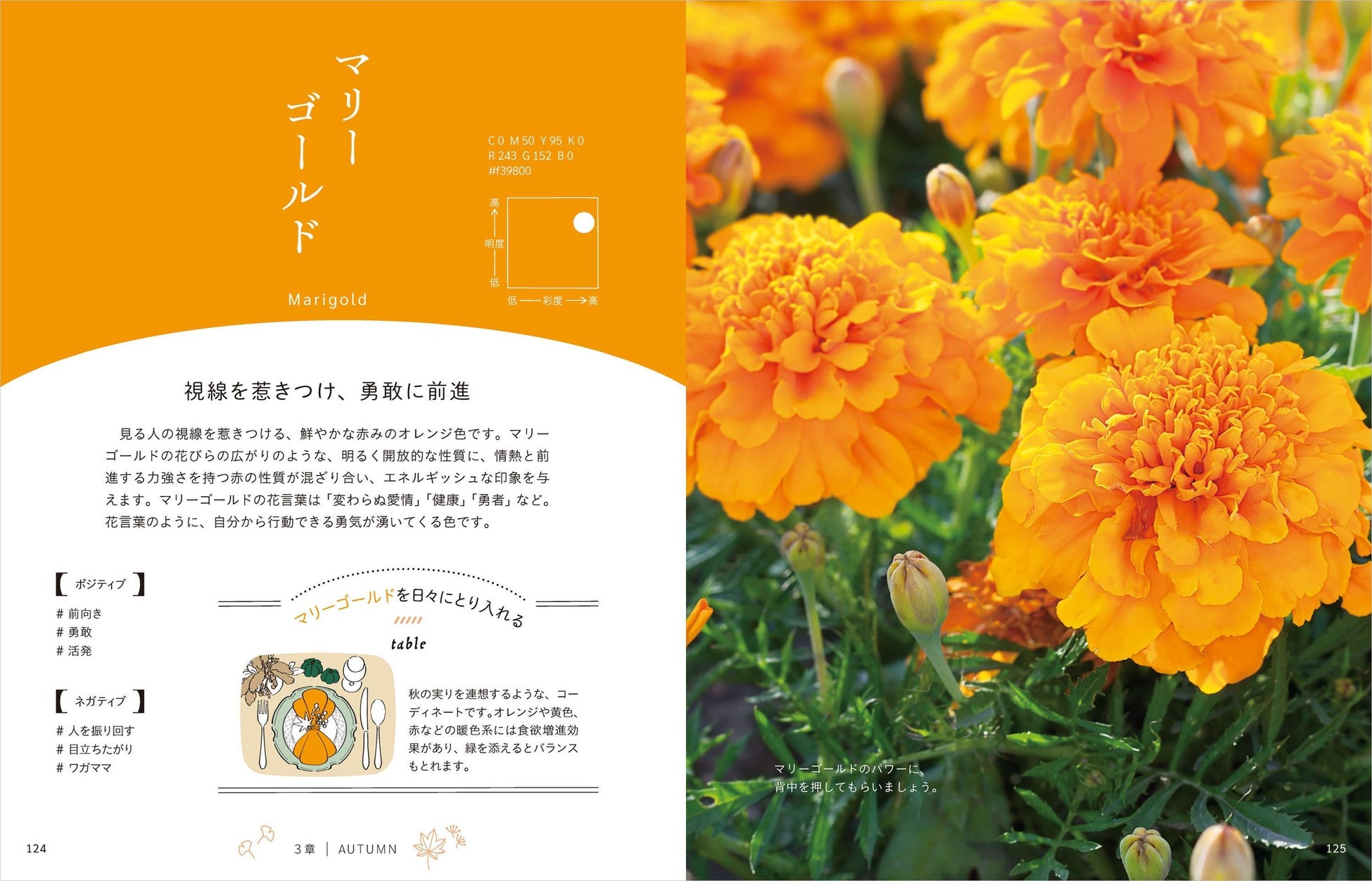 例えば、「マリーゴールド」と呼ばれる鮮やかな赤味のあるオレンジ色は、「視線を惹きつけ、勇敢に前進」する色で、「前向き」「勇敢」「活発」のイメージを与えます。