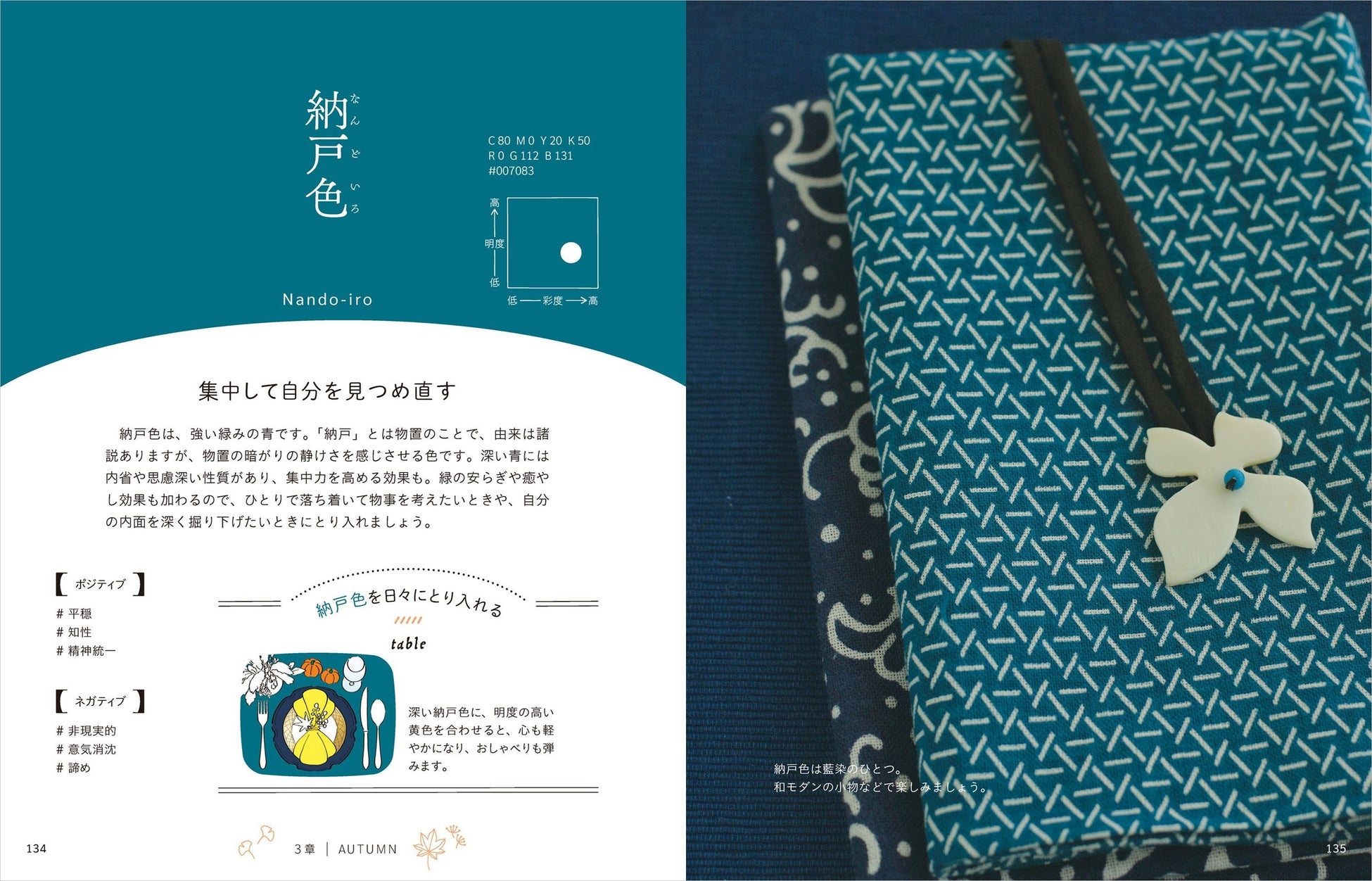 「納戸色」(なんどいろ)は強い緑みの青です。深い青には内省や思慮深い性質があり、集中力を高める効果もあり、「平穏」「知性」「精神統一」の効果があります。