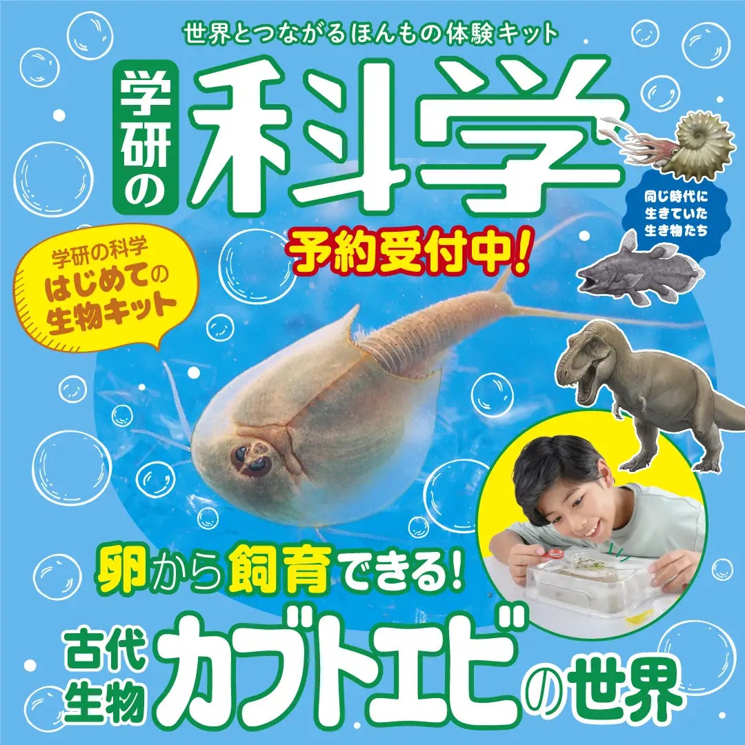 『学研の科学』シリーズでは、6月発売の第6弾『古代生物カブトエビの世界』が予約受付中です。こちらはカブトエビの飼育に必須な「乾燥卵、水そう、えさ」の3点セットのほかに、観察ルーペ、ピンセットなどの便利な飼育道具がついて、すぐに飼育が始められるキットです。生命誕生の感動を味わえ、「生きた化石」とも呼ばれる貴重な生き物を観察・研究することで、生命の神秘と不思議をまるごと体験することができます。