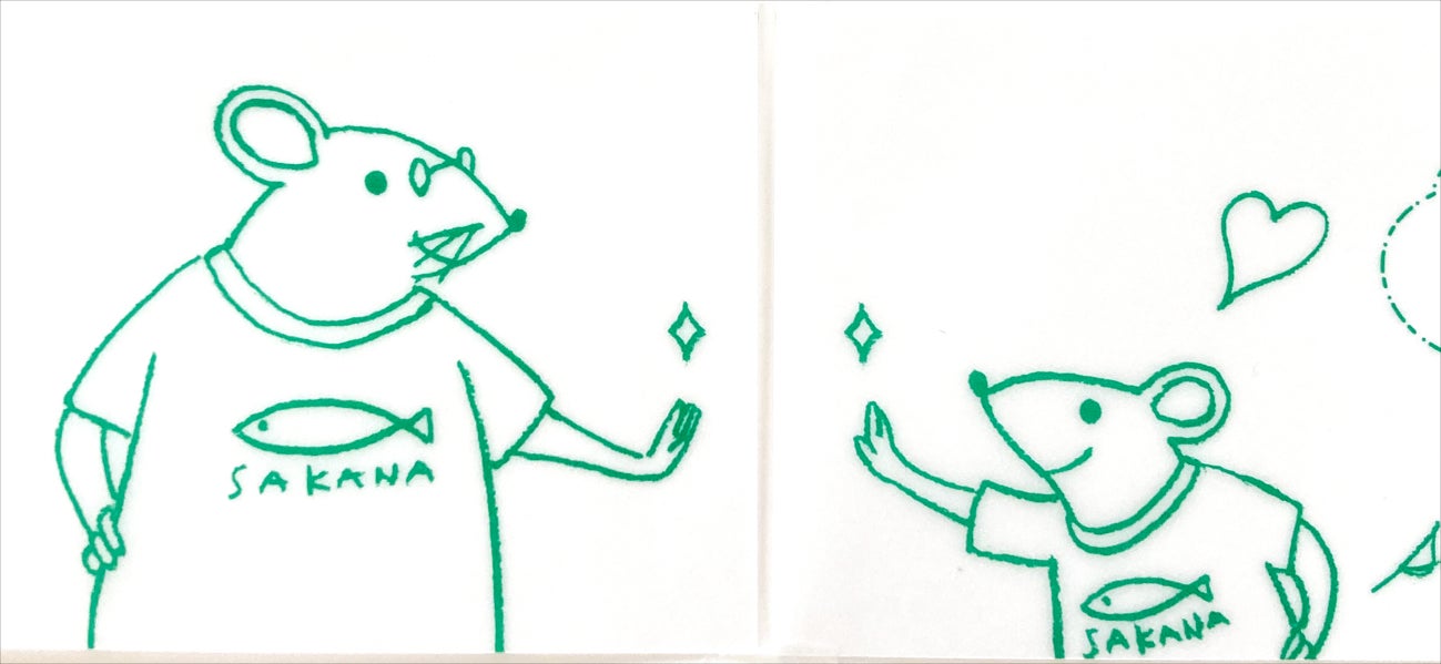 帯の紙は厚めのトレーシングペーパー。表紙の美しい草原の絵が透けて見えます。またカバーをめくって見開きページを開けると、帯の折り返し部分の、表紙側にはパパが、裏表紙側には笑顔のねずくんが隠れています! 実はこの部分で遊べるのです。帯をはずして、ねずくんとパパの手の上にある菱形(◇)のマークを合わせると…ねずくんとパパがハイタッチ! すっかりふたりは仲よしですね。
