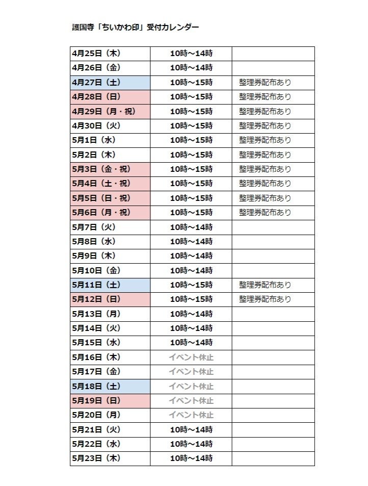 整理券配布カレンダー※4月25日時点の内容になります。